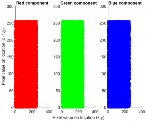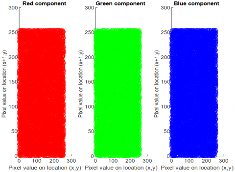 Figure 12 shows the correlation of the plain satellite color image, while Figure 13 displays the correlation of the satellite cipher image.