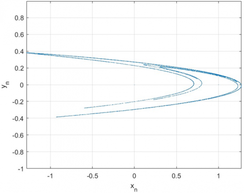where, a=1.4 and b=0.3 are system parameters, the value of a ranges from [1, 1.5] and b ranges from [0.2, 0.4], (xn, yn) and ($x_{n+1}, y_{n+1}$) denote the old and new positions. The permutation in image pixels happens through iterative processes, which makes it a simple and efficient method. The Henon map is distinct in this regard because it is a one-to-one mapping that depends only on integer calculations. Figure 1 shows the behavior of the Henon map.