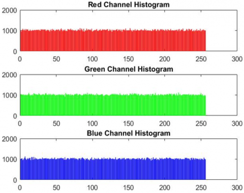 Figures 8 and 9 display the histograms of the ciphered images for the Baboon and Satellite Image 1, showing the red, green, and blue channels. As seen in these figures, the histograms of the enciphered images are largely congruous.