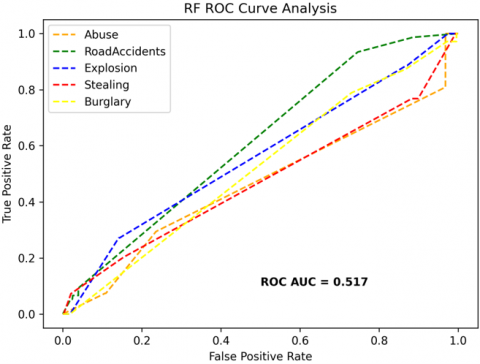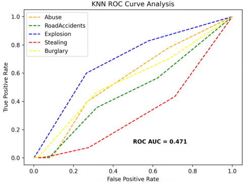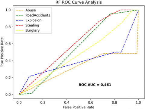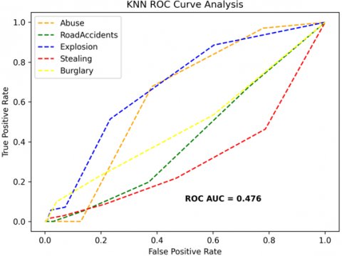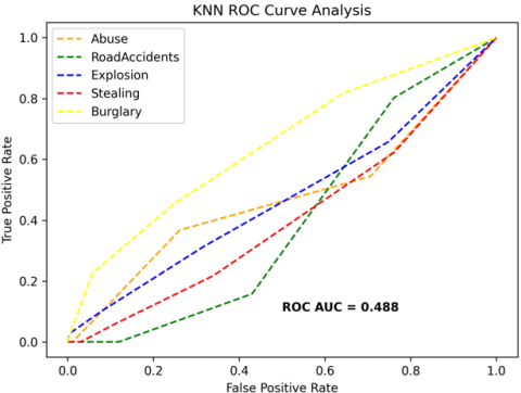 The receiver operating characteristics (ROC) curves are used to depict the classifier accuracy for the multi-class video data. In the experimental work, 14 classes of the UCF-Crime classification data evaluated with the ROC curves. The value of the area under the curve (AUC) indicates the classifier's accuracy. The AUC values are between 0 and 1. Higher values indicate good classifier accuracy. Figure 14 to Figure 19 shows the ROC curves with estimated values of AUC for the proposed models of SDC-VM-KNN, SDC-VM-RF, and SDC-VM-SVC underlying the deep features extraction with the Densenet, GoogLeNet, MobileNet, EfficientNetB0, Resnet 50, and VGG16. The ROC analysis inference achieved good video anomaly classification results using the kNN underlying SDC-VM with all six variants of deep models. Mostly, the AUC scored above 0.5 in all variants of the proposed SDC-VM models.