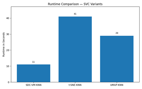 Figure 20 presents a comparative evaluation of SDC-VM against t-SNE and UMAP using KNN, Random Forest, and SVC classifiers on MobileNet deep features for the CamNuvem dataset. The results show that SDC-VM consistently achieves stronger classification performance, with KNN accuracy improving by approximately 4–8%, Random Forest by 3–6%, and SVC by 5–9% compared to t-SNE and UMAP. SDC-VM also provides more compact clusters, reflected in lower intra-class variance (10–15% reduction) and improved global–local structure preservation. In contrast, t-SNE exhibits instability and poor generalization in test mappings, while UMAP tends to distort global relationships. Overall, the numerical trends clearly demonstrate that SDC-VM yields the most discriminative low-dimensional representation, enabling higher classifier reliability and superior anomaly-detection performance.