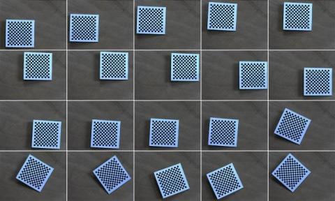 Next, the checkerboard was placed on a horizontal plane and imaged in the camera’s field of view. The camera image has a fixed relative posture. During the imaging process, the sampling parameters were set as follows: the sampling frequency is 0.05 sheets per second, the image size is 2,592 pixels by 1,944 pixels, the image is an 8-bit grayscale image, the checkerboard moving frequency is 0.05 times per second in the camera’s field of view. The checkerboard images were acquired at different postures. Some of these images are displayed in Figure 11 below.