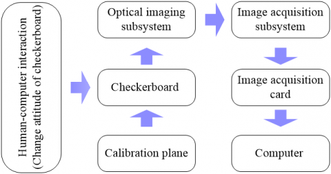 As shown in Figure 1, the automatic camera calibration system consists of a detection platform, a checkerboard, a camera, an image acquisition card, a computer and so on. During the automatic calibration, the checkerboard posture in the calibration plane is adjusted manually so that it always falls in the camera’s field of view. The images of checkerboard at different postures are acquired by the camera and sent to the computer, where they are processed by mathematic modelling and corresponding algorithms.