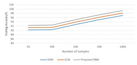 Here Figure-3 describes the different models with their testing accuracy by varying the number of sample images. Here SVM, ELM and DNN are compared with each other. SVM having low testing accuracy over ELM because of its inefficacy over handling the image data. ELM is somewhat better than the SVM but this is also under performed compared proposed DNN testing because DNN learns from past mistakes if the more the training data it produces the more accuracy by learning all possible features.