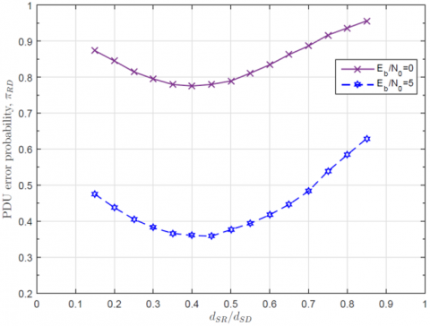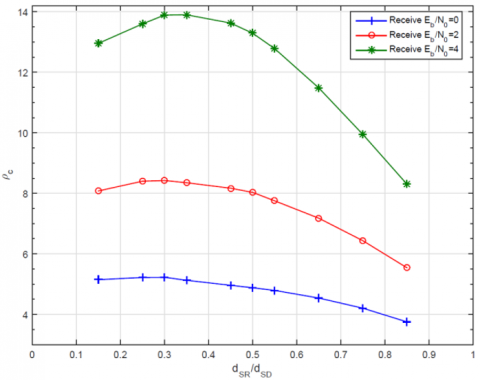 The optimal position appears to be around the location $d_{S R} / d_{S D}=0.35$, where we apparently have the best trade-off between the demodulation errors on the channel S-R and the delivery success on the remaining channel R-D.