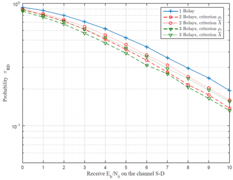 Comparison of the two criterions is shown in Figure 12, where it is shown the probability of PDU error, $\pi_{R D}$, as a function of receive $E_{b} / N_{0}$ per information bit on the channel S-D, 16-QAM modulation, for the following cases: when we have only 1 Relay appearing at that particular location, when we have 2 Relays (only one is chosen) at that location, and when we have 3 Relays (only one is chosen) at that location. As we may see from the comparison, on each case, we see that the performance achieved with our criterion $\rho_{c}$ is better than with the referent criterion $|\bar{\Lambda}|$.