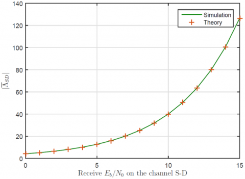 In Figure 2 there is shown the probability of symbol demodulation error, $\tau_{S D}$ as a function of receive $E_{b} / N_{0}$ on the channel S-D, where we see that the theoretical approach matches perfectly with the numerical results using Monte Carlo simulation, while in Figure 3 there is shown the absolute value of LLR on the channel S-D, $\left|\bar{\Lambda}_{S R D}\right|$, where we see that the theoretical approach matches perfectly with the numerical results using simulation.