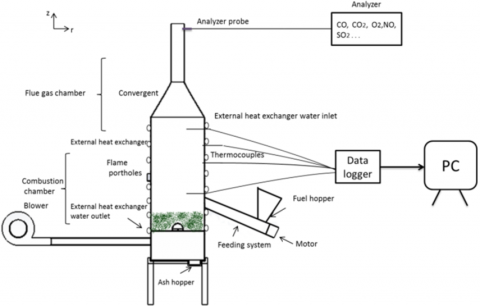 The cylindrical biomass combustor device described in Figure 1 (a) isused for the combustion of raw olive pomace. The experimental setup consists in two vertical compartments: the combustion chamber (fixed-bed reactor), and the flue gas chamber (upper compartment) connected to the chimney by a conical convergent nozzle. In addition, a fuel hopper, a fuel (biomass) feeding system, two blowers, an ash hopper, and a burner hole are also the part of the biomass combustion system. The experimental device is 1500 mm height with a400 mm internal diameter and is made of 6 mm stainless steelthick. A horizontal stainless steel grate with holes of about 1 mm is fixed at the bottom of the combustion chamber. For cooling this experimental prototype, an open loop liquid (water) cooling system is used. Indeed, water flows inside a copper tube (external heat exchanger) which is coiled around the external wall of two compartments of the biomass experimental setup (Figure 1 (a) and (b)).