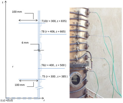 Positions of thermocouples are shown in Figure 1 (b). Thus, thermocouples T5 (r=300 mm, z=385 mm) and T10(r=300 mm, z=835 mm) are localized respectively at the upper position of combustion chamber and the upper position of gas flue chamber to control the thermal behavior at the inlet and at the outlet of the gas flue chamber. Concerning the positions of T6(r=400 mm, z=500 mm) and T8(r=406 mm, z=665 mm), they are respectively placed at the internal wall of gas flue chamber inlet and the external wall of the middle of gas flue chamber in order to quantify the heat loss through combustor wall.