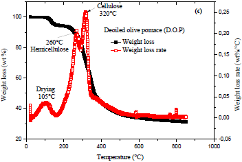 From the proximate analysis, Table 1 shows that volatile matter (VM) is around 70% and it has approximately the same value as various agricultural residues [27]. However, the amount of volatiles from wood is lower and it is about 46% [27]. Additionally, the raw olive pomace contained higher content of volatile matter than fixed carbon (FC), while the percentage of ash is lower. Concerning the elemental analysis, it is noticeable that carbon and oxygen content percentages are higher (48.2% and 44.3% respectively), with low hydrogen percentage (6.1 %) and no sulfur content. When these results are compared with the literature data [10, 13, 16-17, 24] they are in relatively good agreement. On the other hand, raw olive pomace has a significant high heating value (HHV), 22.50 MJ/kg as seen in Table 1. The HHV of this agri-food industry residue is comparable with that of wood, which up to now is the biomass most appreciated and the most used even if its calorific value does not exceed 19.10 MJ/kg [28].