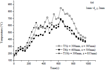 During combustion process, two well defined phases are identified; namely, ignition propagation and char oxidation. For the first phase and for each biomass, temperatures increase rapidly from an initial temperature to a first peak (about 600 °C) relative to each sample type and particle sizes. The smaller ones allow reaching maximum temporal average temperature and improve the moisture evaporation and char burning rates. Also, they exhibit maximum average flux density in radial direction.