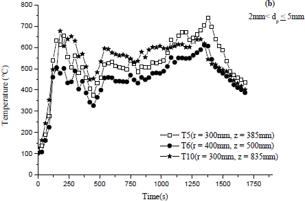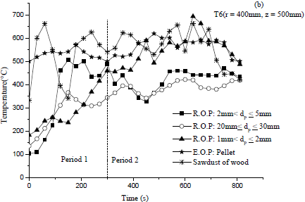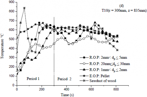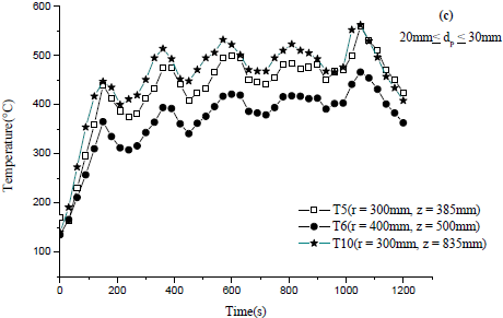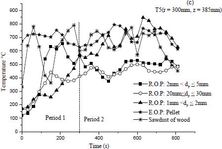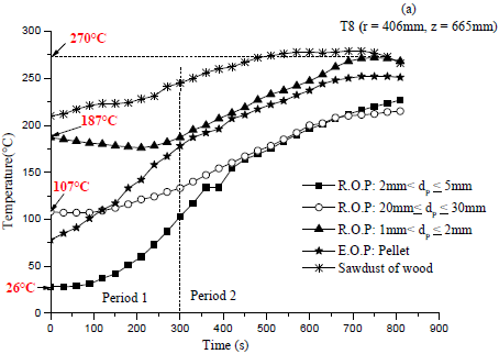 Moreover, the maximal temperature reaches by (R.O.P) is about 270 °C. As for the sawdust of wood, it heats up more and more the external wall combustor which is in direct contact with the heat exchanger device. Figure 7a shows that the external wall temperature increases with decreasing (R.O.P) particle sizes and hence heat released (see Figure 9 (a and b)) which is a guarantee for supplying the external heat exchanger with heat. This is because a smaller particle size improves the moisture evaporation and char burning rates too. Furthermore, it absorbs radiation flux more quickly and raises the burning rate of volatile gaseous fuel which generates higher temperature values. Note that concluding remarks for Figure 7a, especially for period 2, are also valid for Figure 7(b and c) while Figure 7d behaves a little differently since the temperature of large particles ($20mm≤d_p≤30mm$) moves away from that of $2mm<d_p≤5mm$.