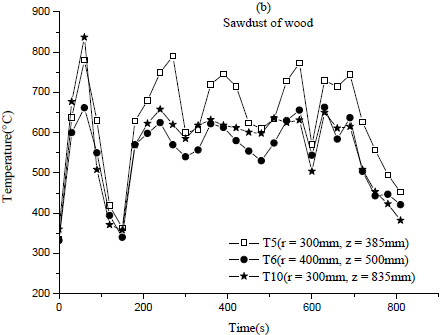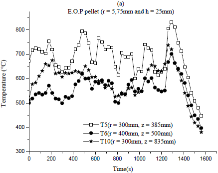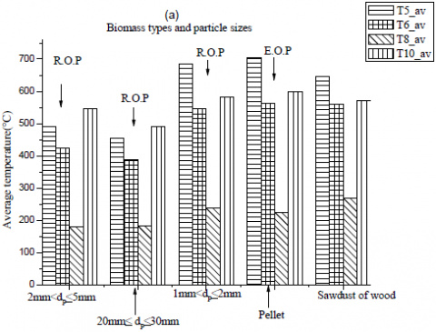In fact, the analysis of the combustion gases shows that the emissions of nitrogen oxides (NOx) are very low and sulphur oxides (SOx) ones are practically nil. These are positive results because they are below the pollutant limitation standards [13-14]. For the R.O.P, the NOx emissions are lower in the case 1 with the lower size of biomass particles. The NOx values obtained in the case of sawdust of wood are interesting, but those from EOP are higher. The results of the carbon monoxide (CO) emissions are very different depending on the five cases of biomass. The CO rate of R.O.P cases is lower compared to the EOP and sawdust of wood cases. This could be due to a bad mixing between air and biomass. However, for the first case of R.O.P (2mm<dP£5 mm), the carbon monoxide (CO) emission value is higher than that of the two other cases. Indeed, in the case 2 (20mm £dP£ 30 mm) and case 3 (1mm <dP£ 2 mm), the amount of CO emission is respectively 323 ppm and 415 ppm, while in the case 1 (1mm <dP£ 2 mm) the CO rate is 1181 ppm. These values are close to the current emission standards in several countries [13-14, 36]. The temperature measurements show that the values are about 600°C in average.