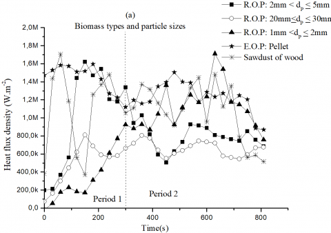 During period 2 (Figure 8a), it is observed that the effects of biomass types and particle sizes on thermal behavior outside the fixed bed combustor, are confirmed. For the three samples (R.O.P with 1mm<dp£5mm, E.O.P and Sawdust of wood), Figure 8b shows that the average heat density exceeds 1MW.m-2.Also, average temperatures, at the inner wall (T6_av) and at the outer wall (T8_av<T6_av), were evaluated for all biomass fuels (Figure 9c). The temperature difference between both sides of the wall generates an important conductive heat flux, described by Fourier’s law, crossing the combustor wall. This difference (T6_av-T8_av) is about 310°C for smaller R.O.P particle sizes. Consequently, the external heat exchanger would receive the necessary quantity of thermal energy for heating up water.