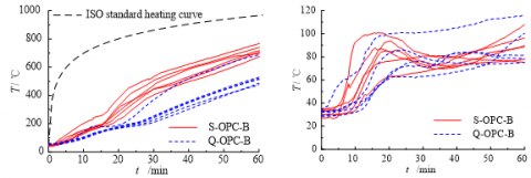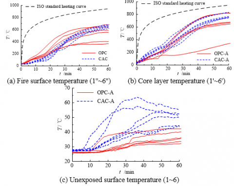 Figure 6 illustrates the relationship between the fire time and the temperature of OPC, CAC, OPC-A and CAC-A measured by 6 thermocouples in different locations. From Figures 6(a) and (b), it can be seen that each of the temperature-time curves contains a preheating segment, a development segment and a steady segment, which correspond to the early, middle and late phases of the test. Due to the absence/presence of the core layer, the division point between the early and middle phases appeared at about 10min in Figure 6(a) and at 20min in Figure 6(b). The following can be observed from the curves in Figure 6.