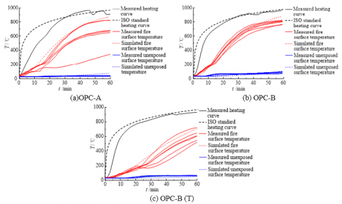Figure 16 compares the simulated and measured temperature-time curves of OPC-A, OPC-B and OPC-B (T). It can be seen that the simulated results agree well with the measured values on the inside of the fire surface, but differ from the latter on the outside of the unexposed surface. The difference mainly comes from the assumption that the layers are closely connected in the finite-element simulation. In fact, there is inevitably some gaps between the panels and the core layer. Besides, the difficulty in measuring the exact thermal conductivity and specific heat capacity of rock wool board also contribute to the error between the simulated and measured data.