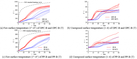 Figure 8 presents the time variation in temperature of the specimens with TRC panel thicknesses. As shown in the figure, the division point between the preheating and development segments appeared at 15 min in OPC-B, 10min earlier than in OPC-B (T), revealing the heat retardant effect of TRC panel thickness. As the thickness increased from 16mm to 26 mm, the fire surface temperature and the unexposed surface temperature both exhibited a declining trend, and the former plunged deeper than the latter. To sum up, the fire resistance limit and the failure mode can be improved by increasing the thickness of TRC panels.