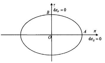 Obviously, the yield function and failure function in the dissipative stress space are a family of ellipses on the $π-τ$ plane. The shape of yield function in dissipative stress space is described in Figure 1, where O is the origin of the circle, and the axes π and τ are the long and short axes, respectively.