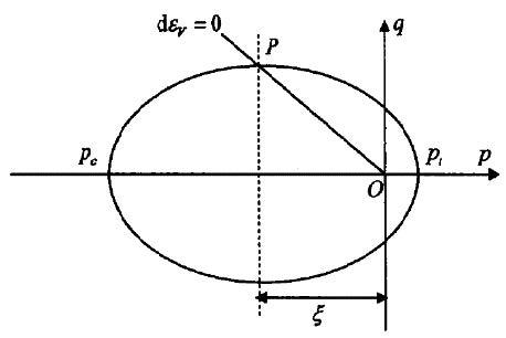 The intersection point ($0, τ$) of $τ$ axis and yield surface in dissipative stress space was mapped to ($ξ, τ$) in real stress space. Thus, the migration stress in the $τ$ direction equals the volumetric stress at the intersection of the yield surface and the line with zero plastic volumetric strain in the real stress space.