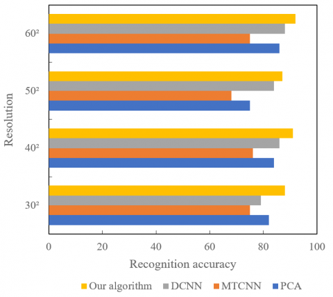 Figure 7 demonstrates the effect number of training samples and resolution on recognition accuracy of low-level face images. The proposed face feature complementation algorithm was applied to classify and recognize five different face poses. As shown in Figure 7, the recognition accuracy of each type of pose was above 80%, when the resolution was 502, and the training set size was 400. The recognition accuracy of each type of pose was above 84%, when the resolution was 602, and the training set size was 450. In addition, the faces were recognized more and more accurately, with the growing number of training samples. Thus, the face recognition and identity verification of low-light images need a sufficiently large training set. However, the recognition effect on images containing strongly left-skewed or right-skewed faces was not satisfactory, even if there were lots of samples.