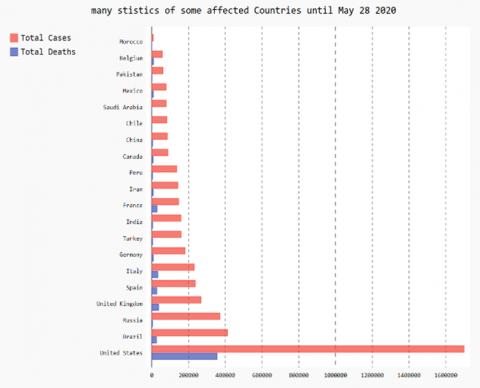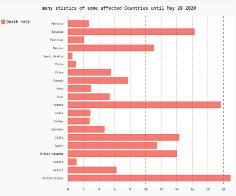 Technologies, especially machine learning is involved deeply to stop the spread of the disease by encouraging researchers to engage in projects related to COVID-19 to end this pandemic. Enterprises, universities, schools changed the method of working by adopting Tele-working and tele-schooling (study-from-home). However, the enterprises, which provide daily needs and medical supplies-, should respect some working protocols such as social distancing and mask-wearing. Connections between familial, personal and professional communities must be established by technology and virtual communications [10]. New Technologies, radio, televisions and mobile phones have to raise awareness by streaming videos and documents about the danger of COVID-19. Figure 1 presents a world map of all affected countries by COVID-19 and Figure 2 presents a histogram of the total cases and death rate of some affected countries until May 28 2020, according to the European Centre for Disease Prevention and Control (ECDC). This pandemic keeps spreading across the world firstly and ruins people’s lives. Therefore, conducting such a study makes it possible to highlight the danger of this disease, the means of its propagation, the methods of prevention from it. It could also highlight the means of propagation of misinformation, conspiracies and rumors about this pandemic that people share in social networks leading to a lot of human damage. So, preventing the dissemination of misinformation, misleading information and conspiracies about COVID-19 in social networks could save our lives.