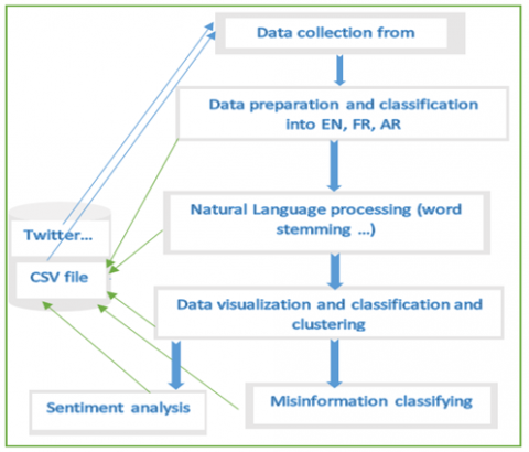 As illustrated in Figure 4, we collect data tweets from Twitter and perform our NLP algorithm to preprocess these data then prepare them, after that, we extract clean text out of URLs, special characters and no meaning words filtration. English, French and Arabic are three languages widely written and spoken on social networks and can be a powerful bank of data to get profit in this paper to catch and classify misinformation, misleading information and rumors spread about the virus. Through the last step, which is data visualization we extract statistics of sentiments of adult connected people about this information in concern of COVID-19 pandemic. These extractions are done for tweets of English, French and Arabic separately. In the second step, we did the same statistics by continent, then by some countries. This can allow us to learn more about the spread of COVID-19 as well as its rate of transmission and mastering the situation.