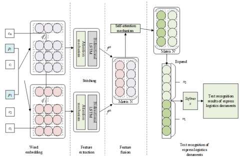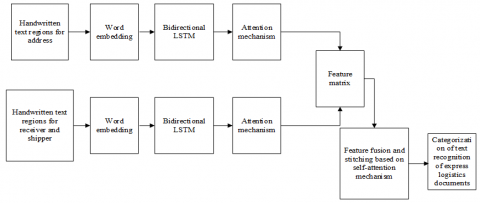 In order to realize the full mining of key semantic information of express logistics document texts, this paper proposes an enhancement strategy of Chinese characters in handwritten text region and constructs an express logistics document text recognition model based on bidirectional LSTM and attention mechanism. Figure 2 gives a schematic diagram of the text recognition process of express logistics documents. The model further enhances the utilisation of key Chinese character information by individually performing repetitive feature extraction of key Chinese characters in handwritten text regions. Meanwhile, to strengthen the feature information that is important for the recognition of Chinese characters in handwritten text regions in the text sequences of the input express logistics documents, the model introduces an attention mechanism that weakens the feature representation of irrelevant information in handwritten text regions. Finally, the image features extracted by the bidirectional LSTM and the attention mechanism are fused in a stitching approach to complete the new feature representation of the express logistics document texts.