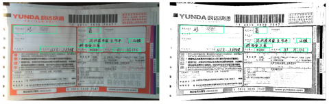 Figure 4 shows the effect of pre-processing the text of an original express waybill. It can be seen that after denoising, greyscaling and binarisation, the text image of the original waybill presents a much better clarity, and the contrast between the handwritten text and the background region has also improved.