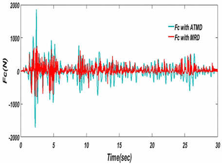 ISMCbf with MRD can reduce the displacement better than ATMD with less control force Fc, and it is derived by small battery level voltage (0-2.25V). As a result, MRD more reliable than ATMD during sever earthquakes.