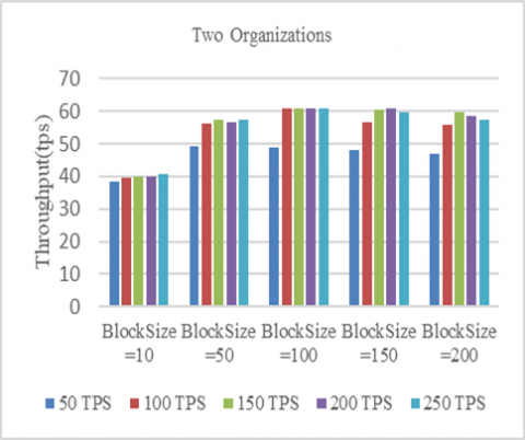 Three scenarios have been proposed: one, two, and three organizations, for each scenario (two peers per organization and one endorser peer in each organization). Each time block size is increased, five rounds (round is an array of objects, each describing the setting of a round) are run. Every round set with 1000 transactions on a fixed send rate (50 tps, 100 tps, 150 tps, 200 tps, and 250 tps). In these scenarios (2sec) block timeout is specified. Performance evaluation could help to measure the impact of scaling the organization and peers when varying block size, Table 1 illustrate basic configuration parameters.
