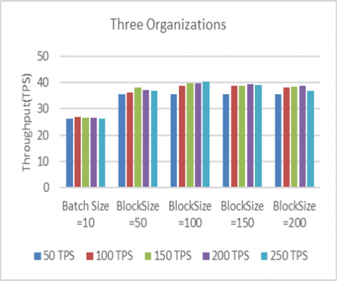 Three different scenarios have been proposed: one, two, and three organizations (two peers per organization and one endorser peer in each organization) with two metrics to monitor; throughput and average latency. Throughput is the rate at which transactions are successfully processed when it is included in a block and committed to the ledger as part of the blockchain in transactions per second. Throughput was given in Eq. (1), where TRT is transaction throughput, tct is total committed transaction, tti is total time.