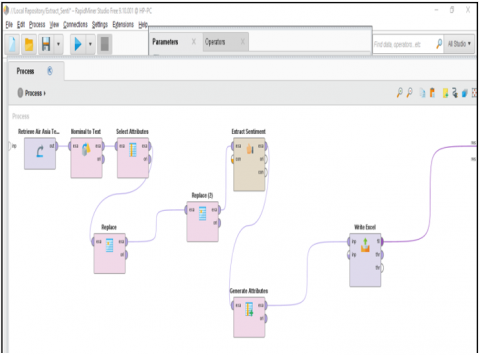 Figure 2 displays all of the Rapid_miner operators, from attribute selection to extraction and creating sentiment_scores for sentiments, and then saving those scores with our polarity condition of pos or neg. Nominal to Text, Select Attribute, Replace, Extract Sentiment, Generate Attribute, and Write Excel are the operators utilized.
