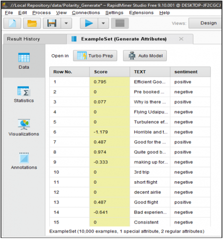 The above Figure 3 depicts the various score values and sentiments on the basis of text or tweets given by the passengers.