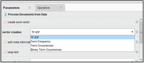 Figure 5. Parameter selection for word vector creation using process documents from data operator
