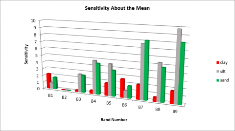 Sensitivity analysis has been applied to express and assure the complicity relation of soil type with reflectance. Figure 4 illustrates the sensitivity of clay, sand, and silt to the bands. It is obvious that Figure 4 shows that the soil type undetectable by band 2. In contrast, band7 and band 9 are the greatest sensitive with the soil type, especially sand and silt while clayey soil can be estimated by band 1, band seven, and band 6. The spectral reflectance of soil type and bands are very complex where all bands are participating in detecting specific but in different weights. Indeed, reflectance variation over bands can be a good platform for building a highly accurate model for soil type estimation. Thus, it is essential to containing all the bands in the ANN model.
