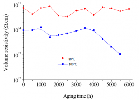 Figure 4. Variation of volume resistivity in function of aging time at 80 and 100℃