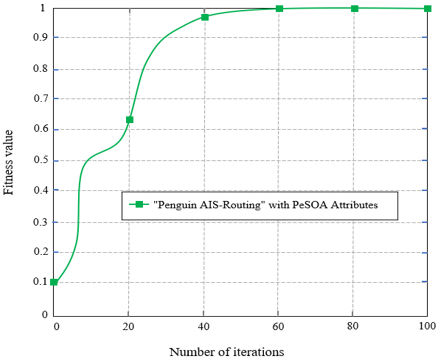 Figure 10 depicts the relationship between the number of iterations for Penguins-AIS-Routing and the convergence of the optimal fitness value for the objective function provided by Eq. (18). Using the previously mentioned optimization technique with a number of iterations equal to 100 and a fitness function, the convergence graph is generated. By looking at the graph in Figure 11, it can be seen that the proposed model gets closer to convergence quicker and achieves a higher overall fitness value for the goal function.