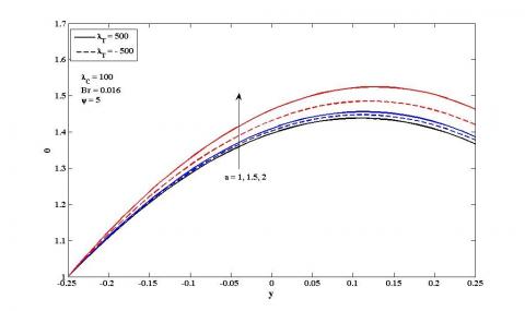 From equations (17) – (19) one can observe that the profiles of u , $\theta$ and $\phi$ depend on the parameters, namely the ratio $\lambda_{T}=\frac{G r_{T}}{\mathrm{Re}}$, the ratio $\lambda_{C}=\frac{G r_{C}}{R e}$, Brinkman number $B r$, temperature difference ratio $T r$ , and concentration difference ratio $R_{C}$ and couple stress $a^{2}$.