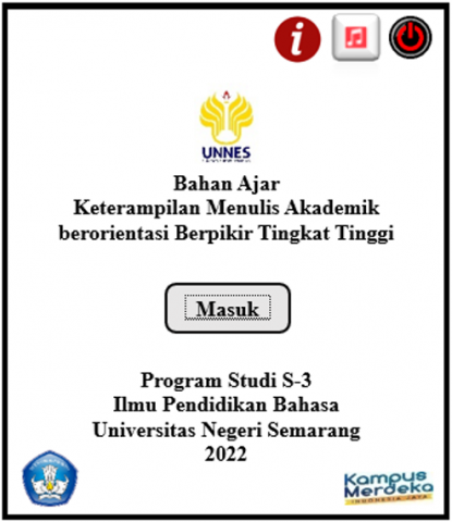 The input required in the first academic writing teaching materials was the existing curriculum. Based on the results of interviews with the head of the study program, some study programs still use the Indonesian National Qualifications Framework (KKNI) curriculum, while other study programs have implemented an independent curriculum. In the curriculum, in general, the learning achievement of an academic writing course states that, at the end of the lecture, the students can write well academically; in addition, the learning achievement at other universities is that the students can write well academically and publish writing at the end of the lecture.
