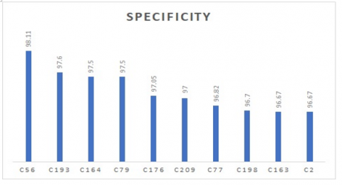 In this analysis for the Figure 13, we know that which of the combinations of Classifiers plus Data preprocessing with A6 datasets has good specificity. From the Figure 13, L1 Linear SVM + L2 Linear SVM & RBF SVM gives the 100% specificity. Succeeding to this, Relief (F.S) + LR [26] gives 98% specificity followed by FAMD (F.S) + RF gives 96.96% specificity.