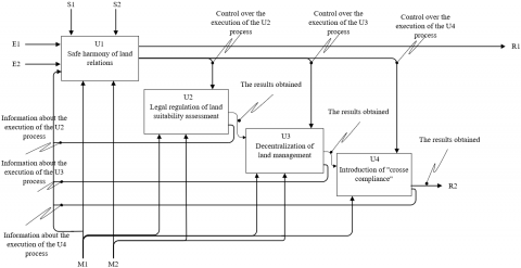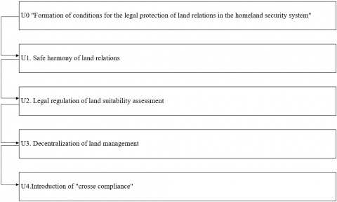According to the methodical approach, the main goal of modeling should be established. It is mathematically denoted as U0 (0- because this is the main initial goal, then each process of achieving it will affect 1,2,3,4, respectively). U0 is in our case, "Formation of conditions for the legal protection of land relations in the homeland security system". It is necessary to present the processes of achieving U0 graphically for clarity (Figure 1).