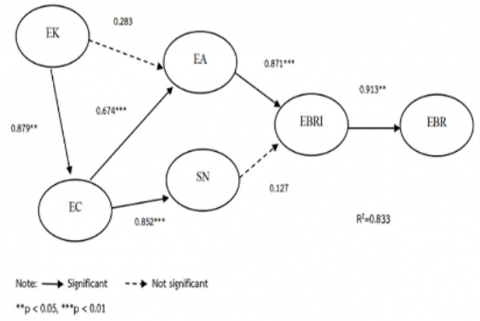 The indirect-impact analysis enables additional tests on the mediation effect among the variables in the proposed model. The analysis results were displayed in Table 4. The results signaled that EK has a direct effect on EC (DE= 0.879), has an indirect effect on SN (IE= 0.749), has a direct effect and indirect effect on EA (DE= 0.283) and (IE= 0.592), respectively, has an indirect effect on ERBI (IE= 0.857) and has an indirect effect on ERB (IE= 0.783).