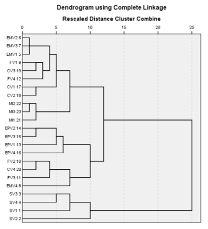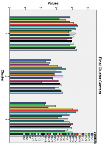 Table 2 presents the data for the number of units in each cluster and their total number and missing units (if there are any). A total of three clusters are formed of a total of 101 respondents. There are 48, 27, and 26 cases (respondents) in clusters 1, 2, and 3, respectively.