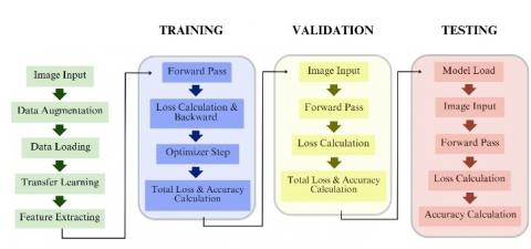 During the training stage, a forward pass is executed at the beginning, and then a backpropagation is run while calculating a loss. When running the optimizer step, the parameter update is performed. This process of forward pass, backpropagation, and parameter update is repeated for a specified number of training sessions. Upon completion of the training, total loss and accuracy are calculated. For validation and testing, it is almost the same order as the forward pass but without backpropagation. Loss and accuracy are accumulated from each process to become the final loss and accuracy.