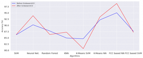 It provides the optimal hyper-parameters to use an algorithm. It has included in the sklears model selection package. It provides the platform for predefined hyper-parameters and it fits the model on a given training dataset. Thus, we can select the best parameters with cross-validation number for individual sets of hyper-parameters. In the proposed study, GridsearchCV is employed in eight different models, to get the best suitable hyper-parameters values. By using new hyper-parameter values, eight ML algorithms have been trained and tested. Hence, there is improvement in prediction accuracy for all eight models has been noted. This has been specified in Table 5 and Figure 18 for evaluating the training accuracy between the two employing GridsearchCV and Figure 19 indicates the accuracy of testing before and after using GridsearchCV method.