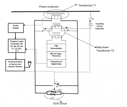The F-PLCC Contains Components like Transformer (T1), Transformer (T2), Switches S1, S2, S3, Power supply, Program Logic controller (S7-1200) with GSM connection, Communication system, FSK Demodulator, Micro controller for data recovery, Digital data converter, SCR (Silicon controller Rectifier) Circuit (ST1, ST2) and Coupling Circuit capacitor (Figure 1) and components working explained below (Figure 1)