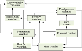 Figure 2. Schematic diagram of ore-forming fluid flow-heat transfer-solute transport-chemical multi-field coupling in heat ore deposits