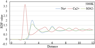 All ions (Na+, Ca2+, and SO42-) exhibit significant clustering (a high RDF value) at distances of 10 and 12 at 300K. The overall RDF value decreases at 2000K, indicating a more uniform distribution of ions in space. The distribution of all three ions at each distance point is relatively uniform, but some small peaks can still be observed. Due to the greater kinetic activity caused by high temperature, the RDF values are further averaged at 4200K and 5000K. The RDF values of Na+, Ca2+, and SO42- are almost the same at these two temperatures, indicating that the increase of temperature makes the spatial distribution of ions more uniform.