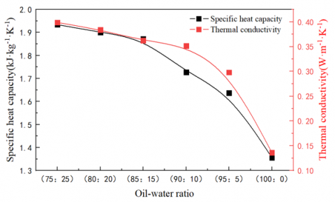Figure 3. Effect of oil-water ratio on specific heat capacity and thermal conductivity of drilling fluid