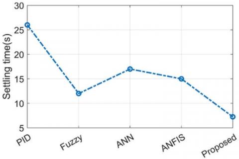 Figure 13 compares the proposed system's overshoot to that of existing methods. The overshoot of the proposed system is 0.035 whereas the overshoot of PID [30], fuzzy [30], ANN [30], and ANFIS [30] are 0.049, 0.71,0.045, and 0.44 respectively. Overshootof the proposed system is low whereas overshoot of fuzzy techniqueis high. Overshoot is reduced by differential controller algorithm which eliminate overlying fluctuations to steady state conditions with loads by measuring optimal cyclic amplitude value.